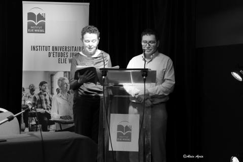 A sa suite, la lecture d’extraits choisis d’œuvres d’Elie Wiesel a été confiée au comédien Philippe Bozo et à l’universitaire Michèle Tauber. La lecture magnifique lecture à deux voix, sobre et précise, a permis d’entrer immédiatement dans la matière textuelle de Wiesel.
